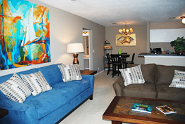 bedroom, a pullout sofa in the cozy den, and bistro table for four.